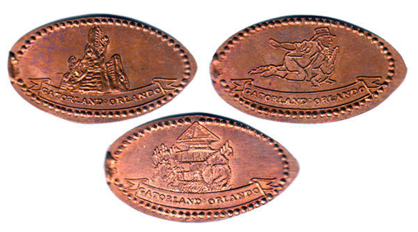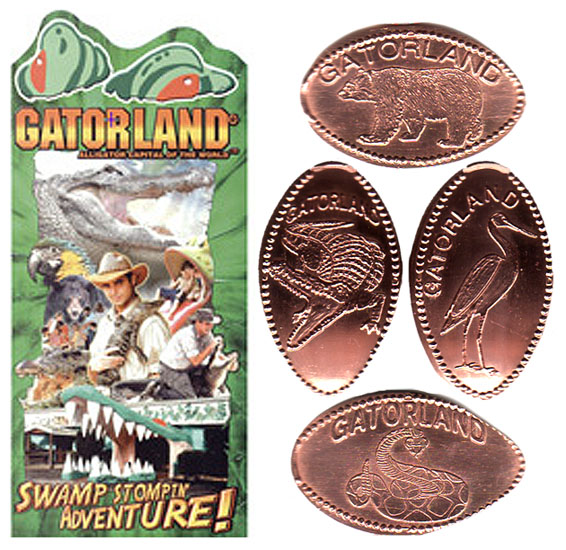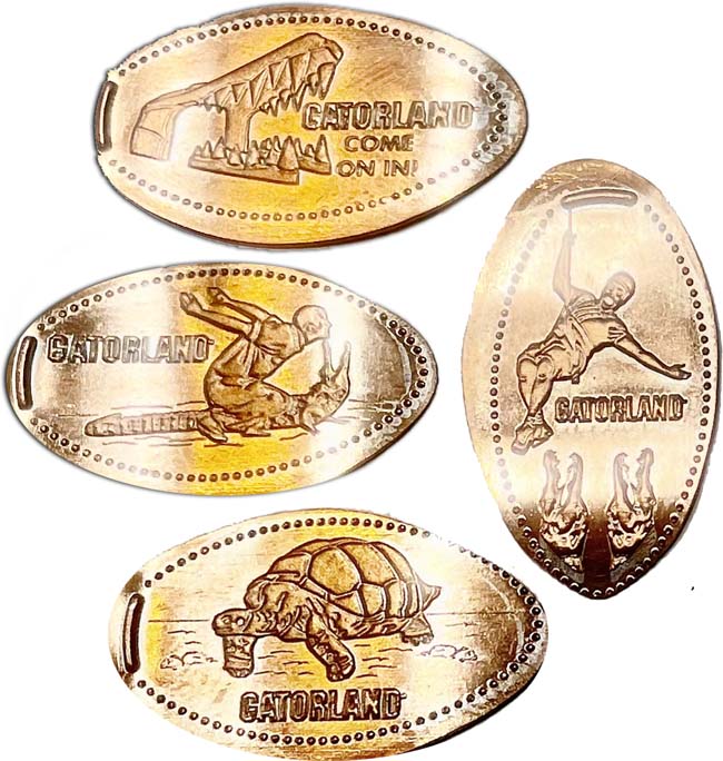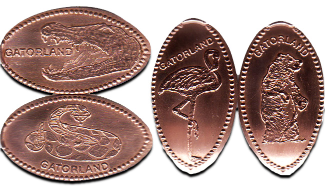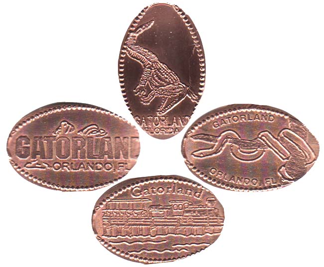 Retired 4: 1) Train; 2) Snake on branch; 3) Alligator; 4) GATORLAND logo with gator eyes.