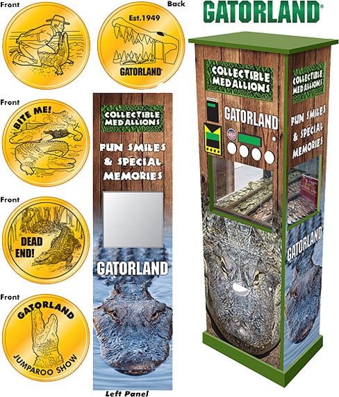 Machine 5: (2020) is beside a photo booth where you can purchase photos they take of you beside a gator statue on the strip with the petting zoo, it is right beside the white wax gator statue maker and an identification tag maker. Designs are: