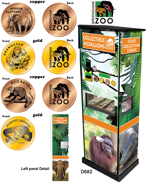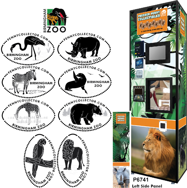 Machine 6 (2019) 8 designs. Cost $1 each or 8 for $5, Preloaded Zinc pennies. Designs are: