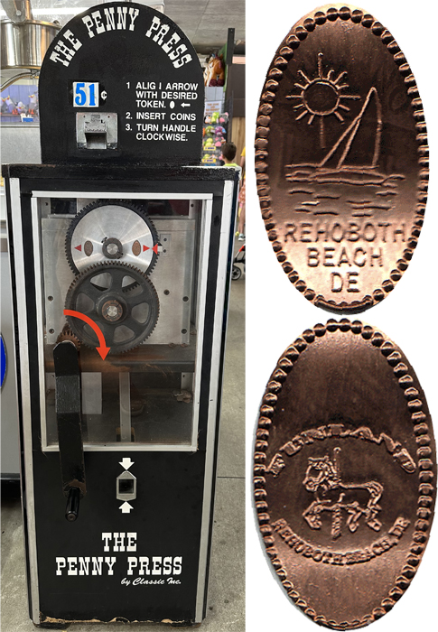 Machine 1 is black and near the kiddie boat ride and souvenir desk in the inside part of Funland. Cost to press: 51¢ each design. Designs all have a beaded border with 'Rehoboth Beach DE':