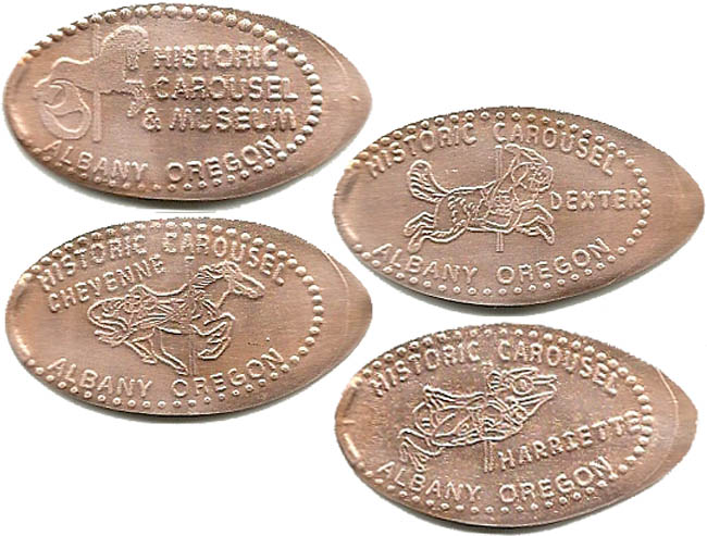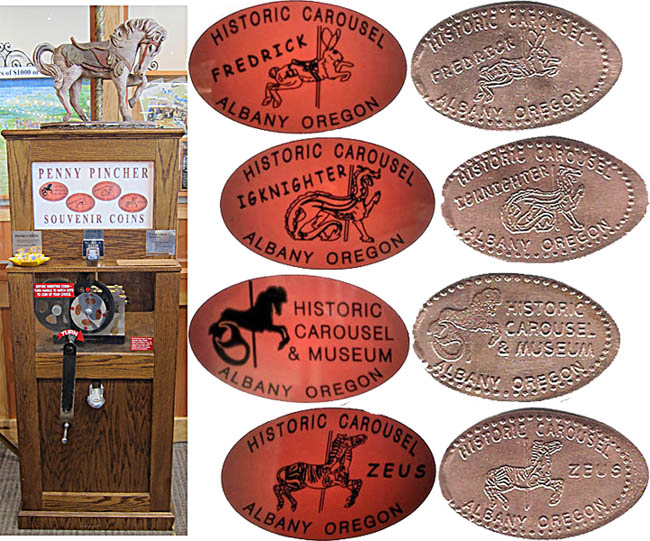 Machine 1: in the gift shop to the right, across from the cash register. Designs all have 'Historic Carousel Albany, Oregon' on them.
