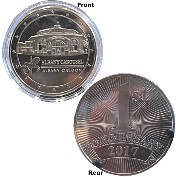 1) 'Albany Carousel Albany, OR', an image of a Carousel and carousel horse, and an exclusive number on the bottom for the numbered variety. Obverse: 1st Anniversary 2017.