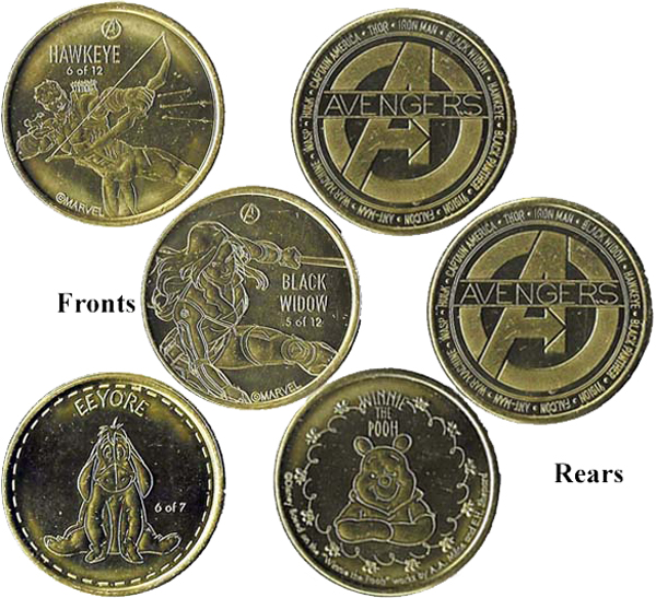 Retired From Token Machine 4: (2024) 1) 'Hawkeye 6 of 12'/ Rear- 'Avengers' A', names of Avengers around outside, 2) 'Black Widow 5 of 12'/ Rear- 'Avengers' A', names of Avengers around outside, 3) 'Eeyore 6 of 7'/ Rear- 'Winnie the Pooh', name over, vine border,