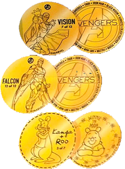 Retired From Token Machine 5 (2025) 1) 'Kanga & Roo 3 of 7'/ Rear- 'Winnie the Pooh', name over, vine border, 2) 'Falcon 12 OF 12'/ Rear- 'Avengers' A', names of Avengers around outside, 3) Vision 7 or 12'/ Rear- 'Avengers' A', names of Avengers around outside,