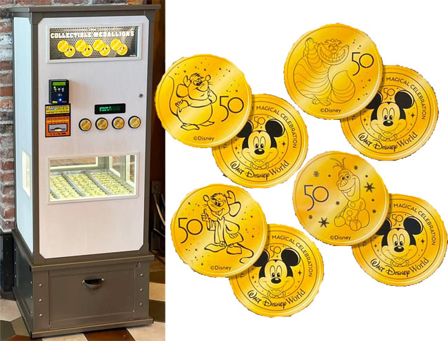 Retired Token Machine 2: (100th anniv): 1) Snow White and Mice, 2) Moana, 3) Joy, Sadness & Bing Bong, 4) Dumbo & Timothy, Rear- 100 years of Wonder logo