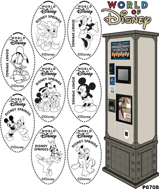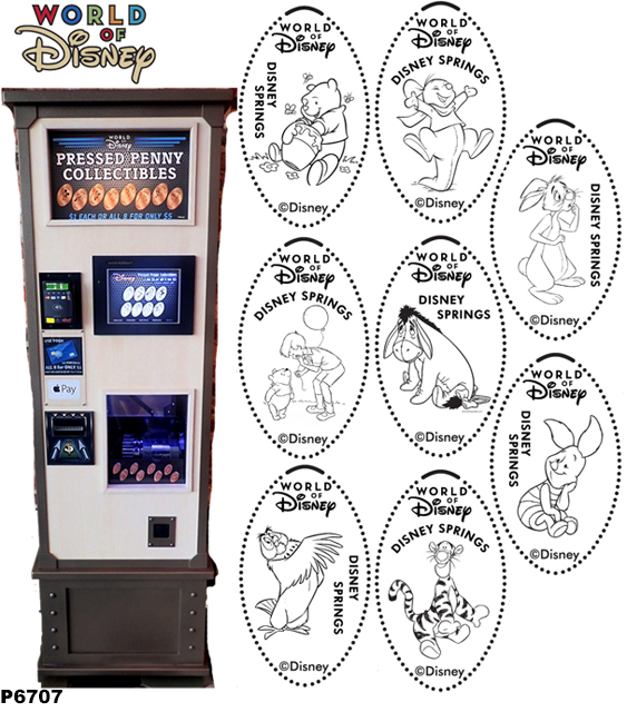 Machine 6: (2018) 8 penny machine preloaded machine. $1 for one, $5 for all 8. All have 'Walt Disney World, Disney Springs' on them. Designs are: