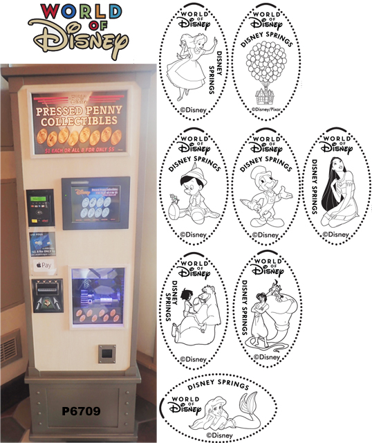 Machine 5: (2018) 8 penny machine preloaded machine. $1 for one, $5 for all 8. All have 'Walt Disney World, Disney Springs' on them. Designs are;