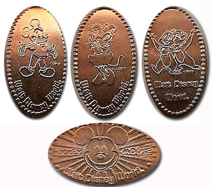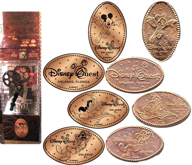 RETIRED was located inside gift shop at Disney Quest attraction exit. This was a refurbished machine with older designs. These pennies cost $1.01 each. Designs: 1) Mickey Mouse's head "Mickey Mouse/Walt Disney World" (H); 2) Mickey Mouse "Walt Disney World" (V); 3) Minnie Mouse "Walt Disney World" (V); 4) Chip & Dale "Walt Disney World" (V).