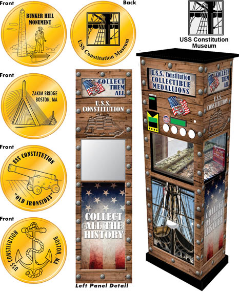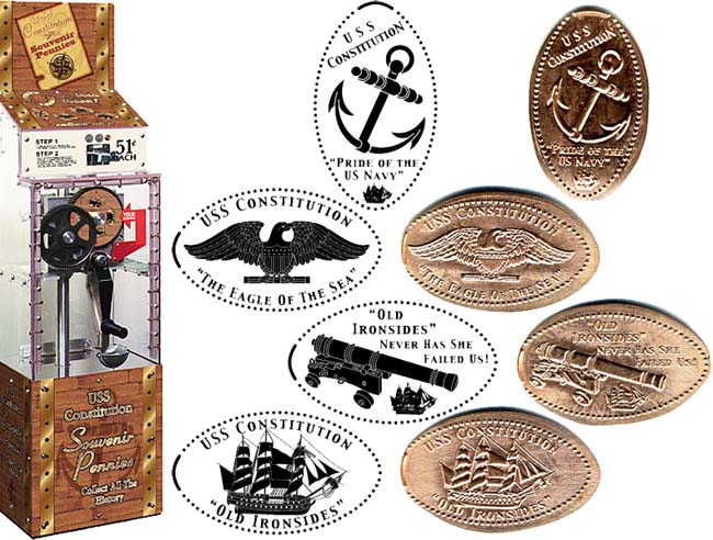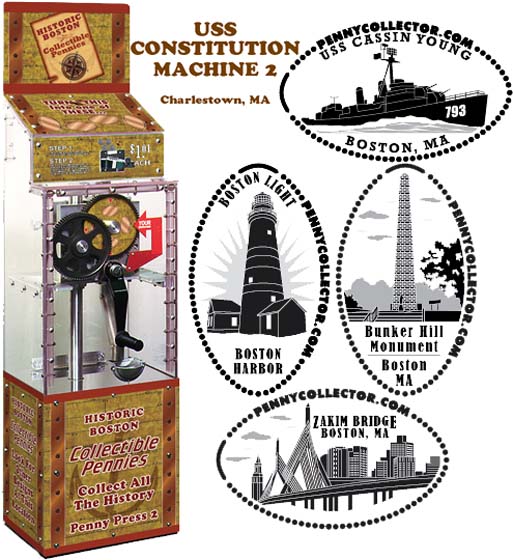 Charlestown Navy Yard, Building 22 (PO Box 1812) Charlestown, MA , 02129 Phone: 617-426-1812 Website The USS Constitution Museum is inside the Navy Yard, go beyond all the Jersey barriers and chain link fences, past the dry dock. Don't be confused by the National Park Visitor Center which is outside the gates and which does not have a machine. Once inside the museum (no admission is required, a modest donation is suggested), the machine is in the Gift Shop, in the back near the books. Price is $1.01 per design.