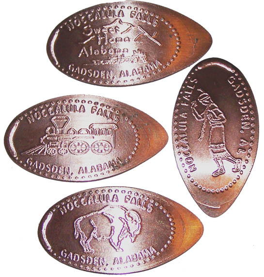 Machine 2 is located on the train station ticket platfrom located Jack's restaurant by ticket booth for train ride. All have 'Noccalula Falls Gadsden, Alabama (AL) on them. Designs are: