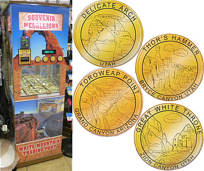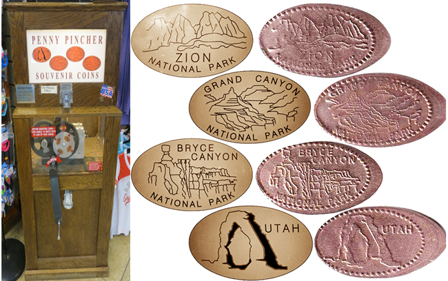 Machine 1 is right by the entrance of the trading post not the convenience store. Cost to press: 51¢ each design. Designs all have a beaded border: