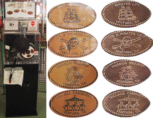 The penny machine is in front of the carousel across from the snack bar. Cost to press: 51¢ each design. Designs all with 'RR' (Rocky Rockholt) at the catch notch and 'Ventura, CA':