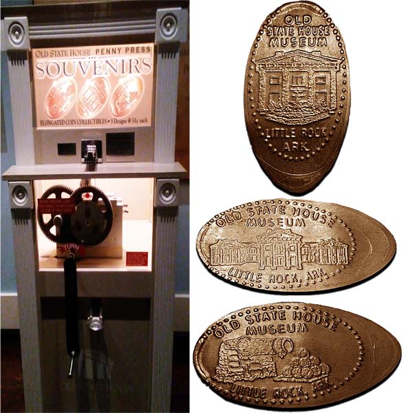 300 W. Markham Little Rock, AR , 72201 Phone: (501) 324-9685 Website New penny machine with three designs located on the first floor. After you enter the building, go to the right and it is in the hallway going towards the "Pillars of Power" permanent exhibit. (Follow the signs to the elevator and you'll find it)