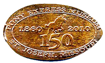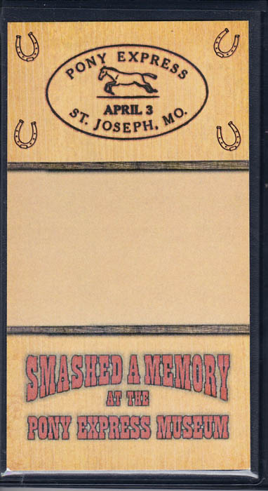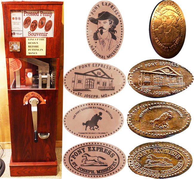 Machine 1 is inside at the back of the gift shop. Cost to press: 51¢ each design. Designs all have a beaded border with 'Pony Express':