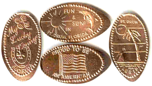 Designs: 1) My Lucky Penny Florida with horseshoe and 4 leaf clover, 2) Fun & Sun in Ft Drum, FL with dolphin and sun, 3) Proud to be An American with flag and Ft Drum, and 4) Florida sunset with palm tree.