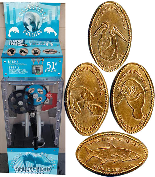 11/09/2022 machine upstairs, outside of snack shop, all copper pennys rolled well, 2 Manatees, 1 Pelican, 1 Snook |