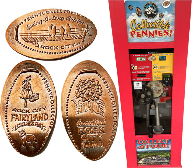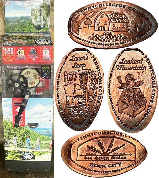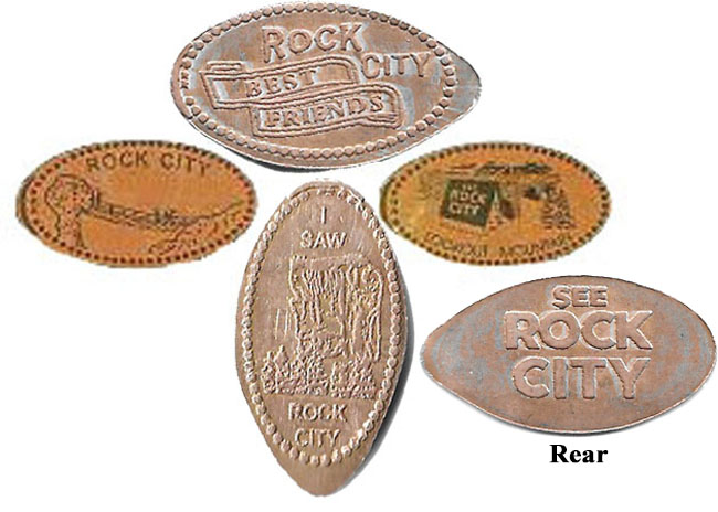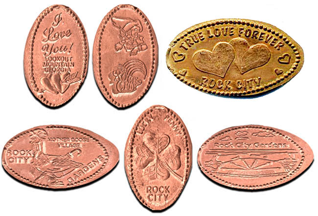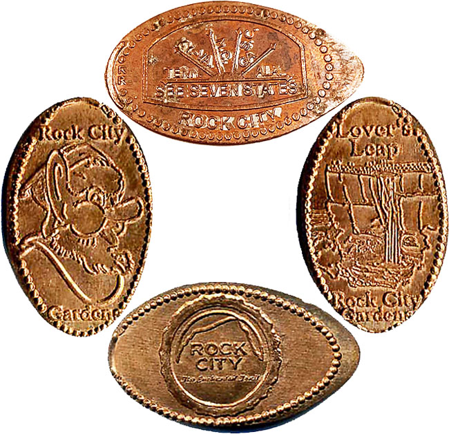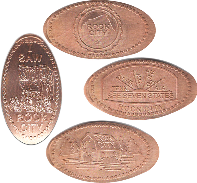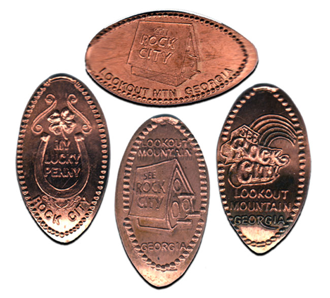 Retired 3: 1) 'Rock City Lookout Mountain, Georgia', Building with name on roof, 2) (H) 'Rock City Lookout Mountain, Georgia', Building with name on roof, 3) 1) Rock City Lookout Mountain, Georgia', rainbow logo, 4) 1) Rock City My Lucky Penny',