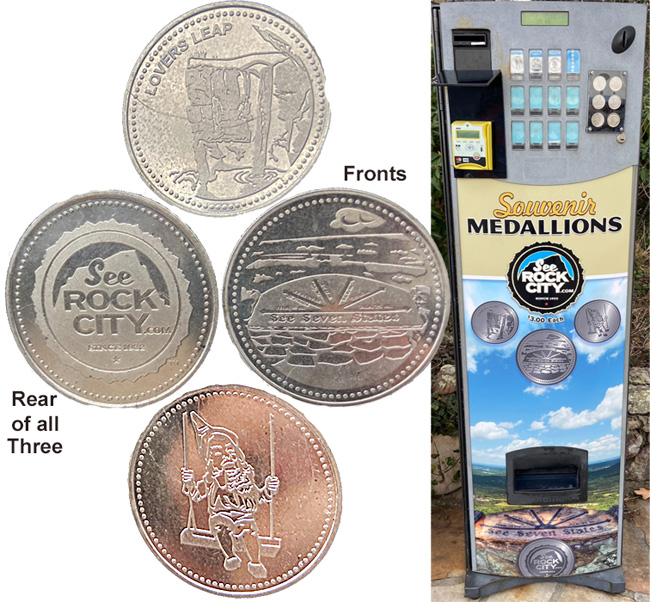 Token Machine 1 & 2 is behind Lover's Leap and the seven state flags. It accepts credit cards. The tokens are $3 each. Designs are: