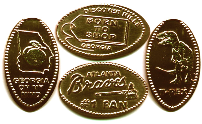 Retired Designs: 1) Born to Shop Discover Mills Georgia, 2) T-Rex Dinosaur, 3) Georgia on My Mind with peach and map, 4) Atlanta Braves #1 fan |