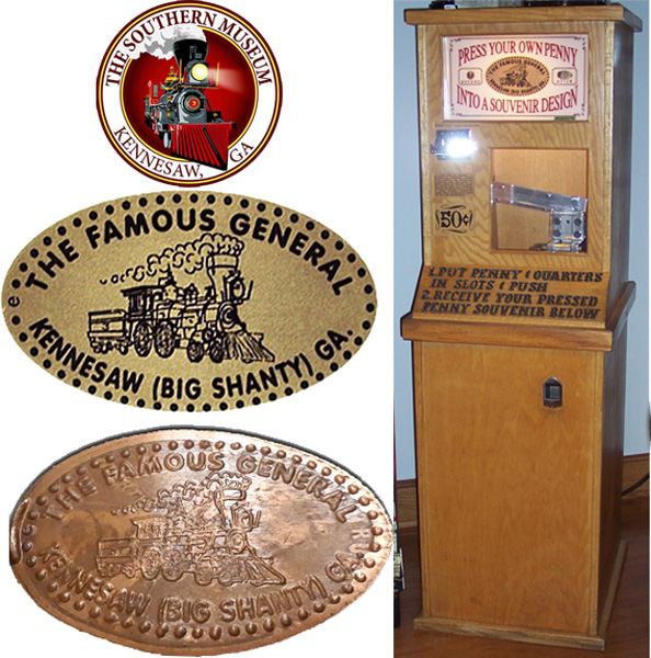 The 1-die machine is in the gift shop next to the register. The gift shop also sells passport-style penny books for collectors. Design: steam engine with "The Famous General / Kennesaw (Big Shanty) GA."
