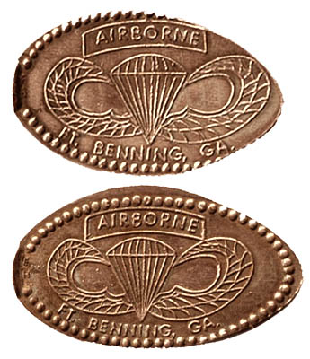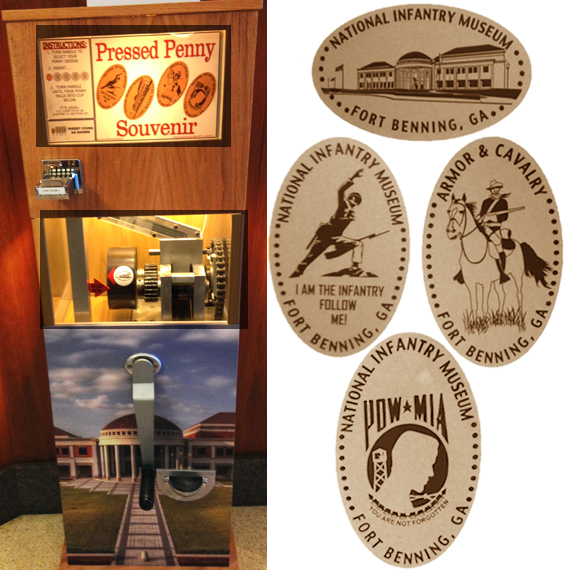 Machine 2 all have 'Fort Benning, GA', on them. Each penny cost $1.01 - 4 quarters and the penny needed to press. Designs are: