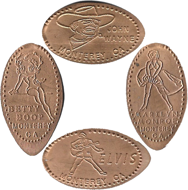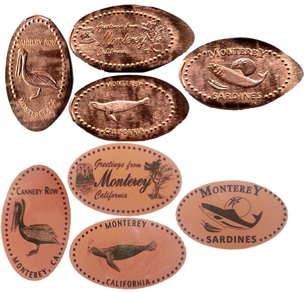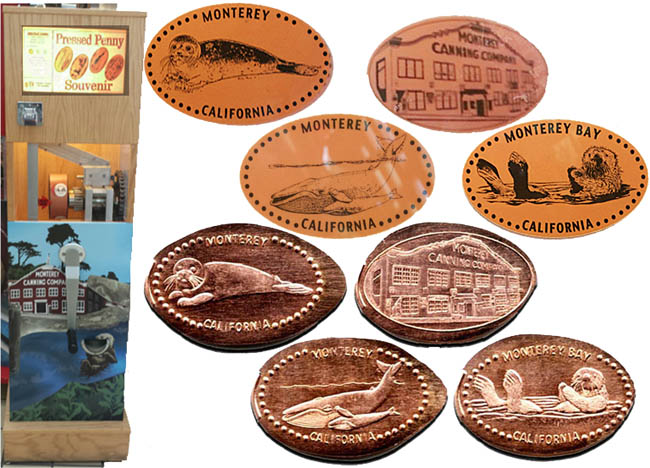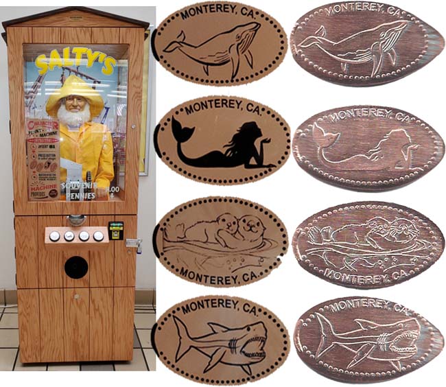 Machine 8: (2019): is still upstairs across from the candy store. All cost $1.00 and are preloaded with Zinc pennies. All have 'Monterey, CA' on them and are in a 'Salty' the sailor machine. Designs are: