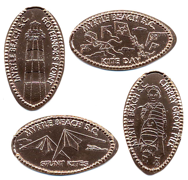 Moved 1 designs - all say "Myrtle Beach" Machine on the sidewalk. Takes 2 quarters and a penny.