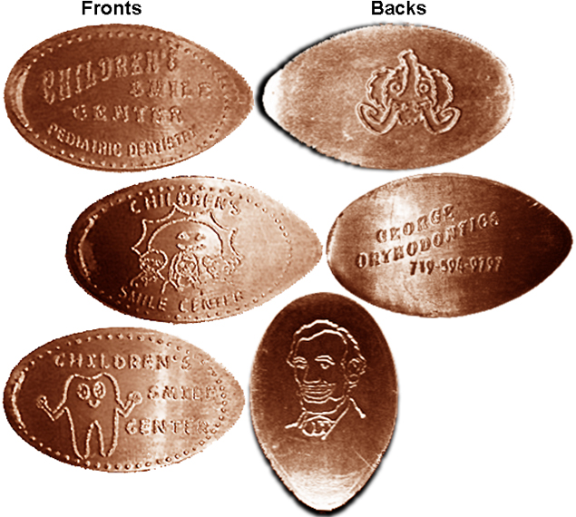1) "Children's Smile Center Pediatric Dentistry" in fancy lettering. The back image is Abraham Lincoln Smiling with braces on his teeth.