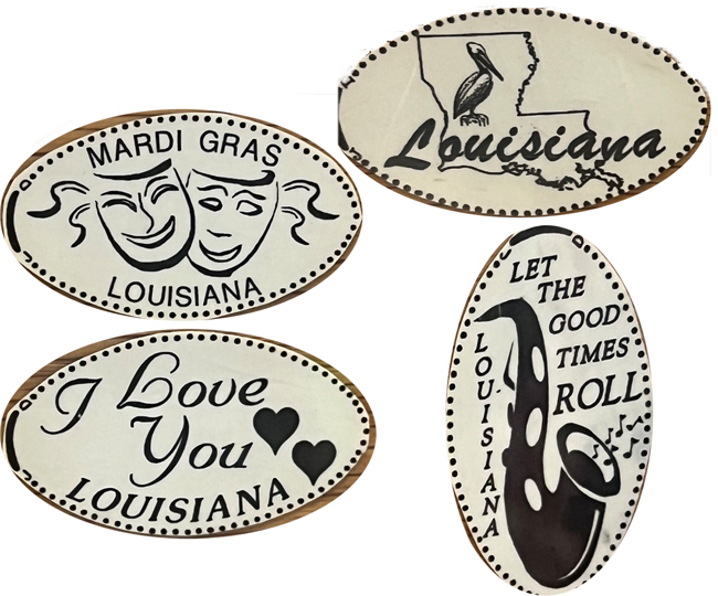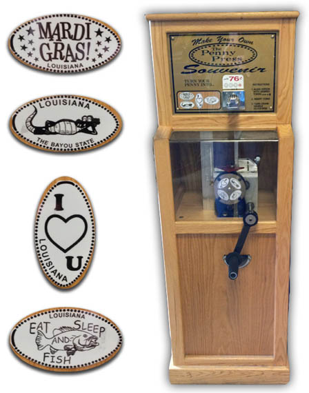15125 HWY 395 Roanoke, LA , 70581 Phone: (337) 753-2042 Exit 59 off I-10. Machines are located on the left side of the double set of doors to the right. Each penny roll costs $0.75. This is a hand-crank "The Penny Press" machine.