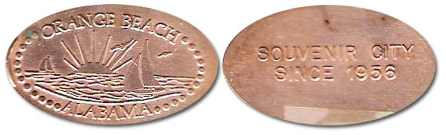 Two single-die electric machines. The designs are both double sided, with the same design of a sailboat at sunset. One says Orange Beach, Alabama. The other says Gulf Shores, Alabama.
