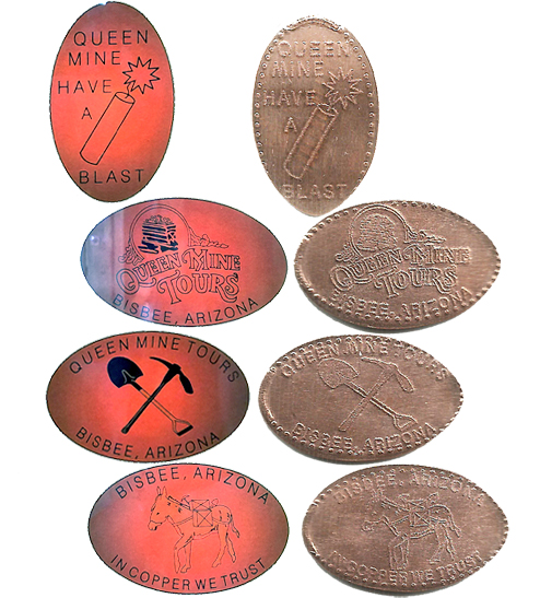 3) 'Queen Mine Tours, Bisbee, Arizona', crossed pick and shovel,