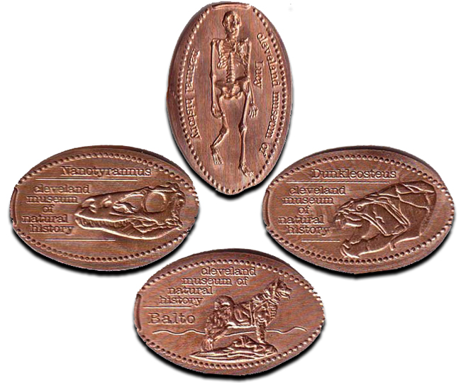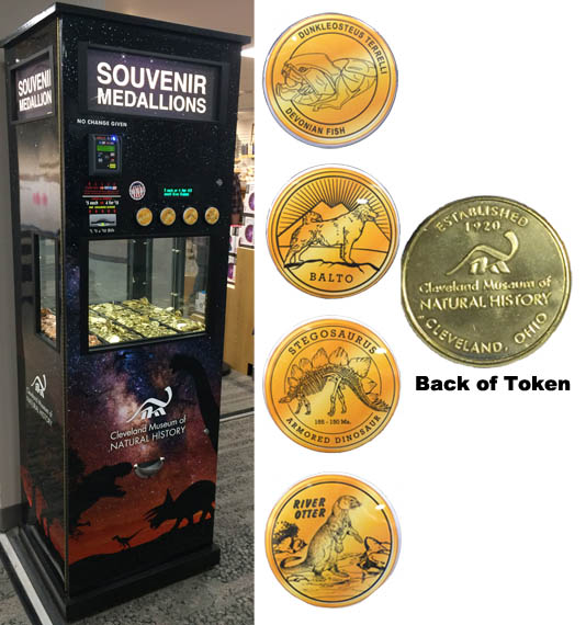 Token machine in storage during construction then retired: The Dunkleosteus token is copper colored, the other three all gold. All four designs have the museum logo on the back. $5 each or $15 for the full set of four.