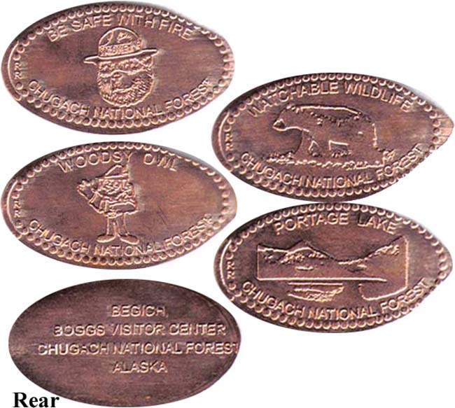 There are 4 horizontal dies that are "mules" with 'Chugach National Forest' on the front and 'Begich, Boggs Visitor Center' on the back. Designs are: