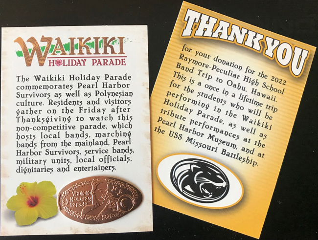 2021 Waikiki Holiday Parade Fund Raiser sets (Money to help send Paul's Daughter to Hawaii with her high school band to play in the Friday after Thanksgiving 2022 Waikiki Holiday Parade, also at the Pearl Harbor Museum and on the USS Missouri)