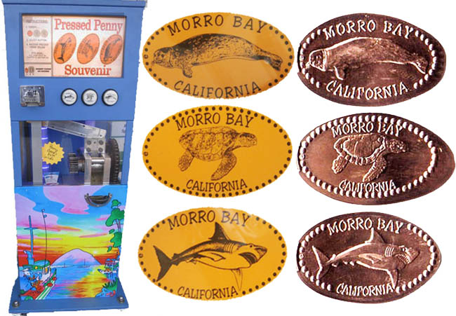 Machine 1 is outside in front of the store, Cost to press: 51¢ each design. Designs all have a beaded border with 'Morro Bay California':