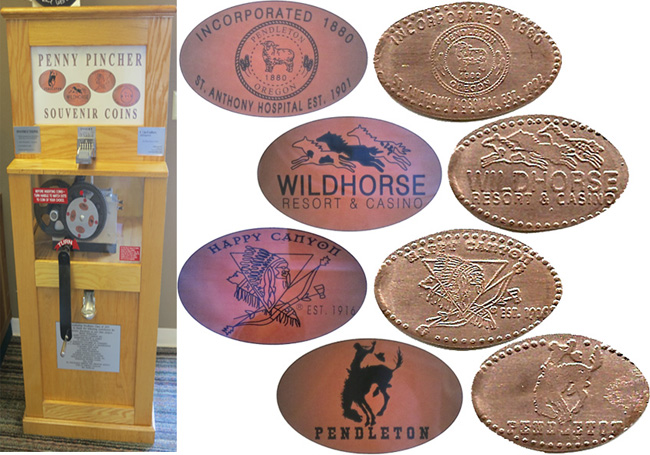 Machine 1 is inside to the straight back of the entrance. Cost to press: $1.01 each design (4 quarters only). Designs all have a beaded border: