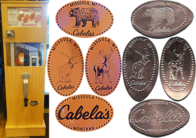 The penny machine is to the right as you enter the store. Designs all with 'Cabela's':