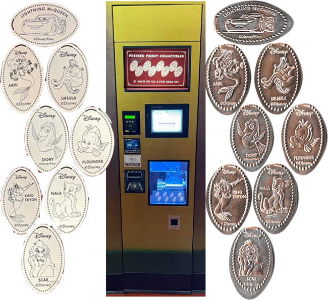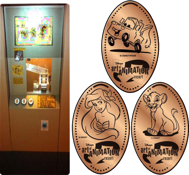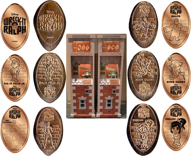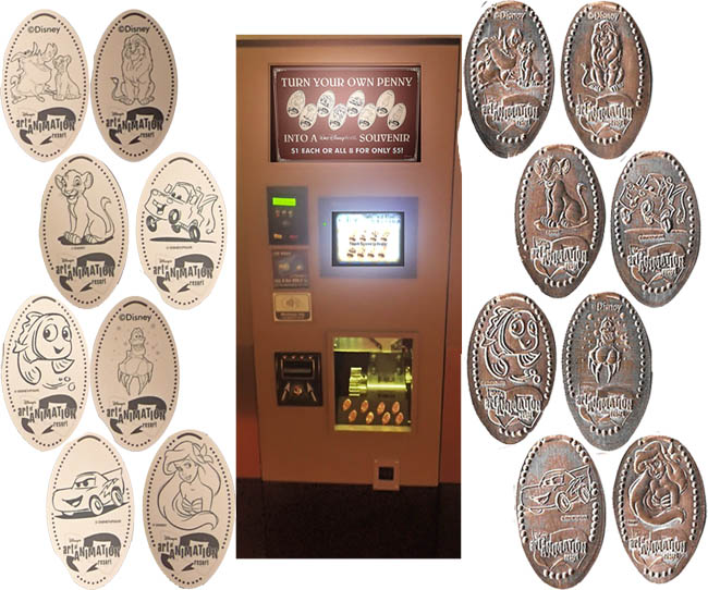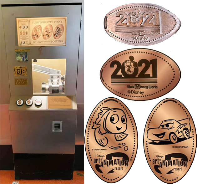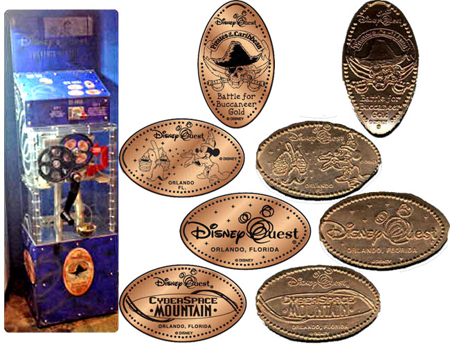 There are many machines throughout the park (a mix of Eurolink and PennyCollector) and they change constantly. No one list is accurate or complete, so please use the information here as a guide only. You may want to consult James' very fine listings available at presscoins before venturing out. And once in the park, you may also want to ask for a listing at Guest Services.