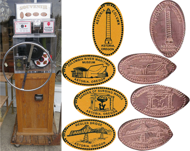 Machine 1 (Placed 7/14/2022) is inside the front door. Cost to press: 51¢ each design. Designs all have a beaded border with 'Astoria, Oregon':