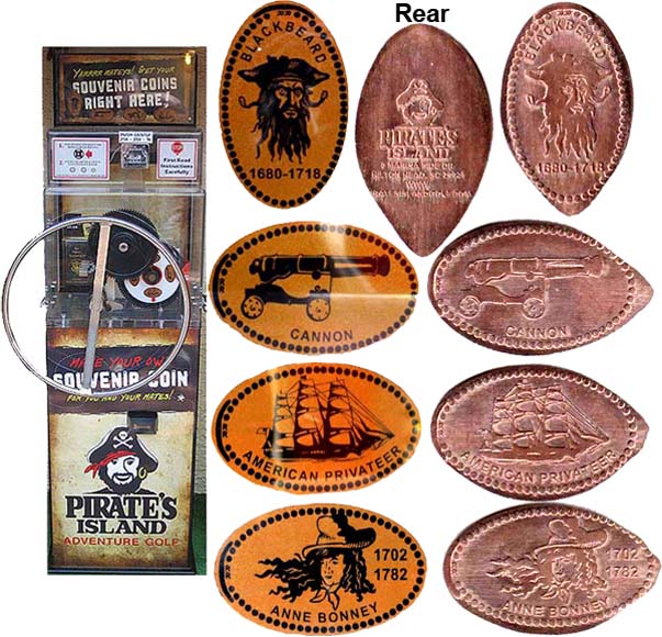 Note the penny backs all have 'Pirate’s Island 8 Marina Side Dr Hilton Head Island www.piratrsislandgolf.com'.