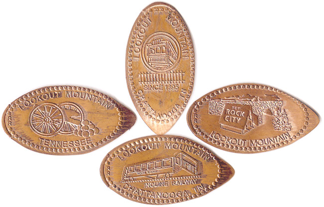 Retired 1: 1) 'Lookout Mountain Chattanooga, TN', Track and tram car, 2) 'Lookout Mountain Tennessee', Civil War cannon, 3) 'Lookout Mountain, See Rock City', buildings and wall, 4) 'Lookout Mountain Chattanooga, TN', Tram car on track.