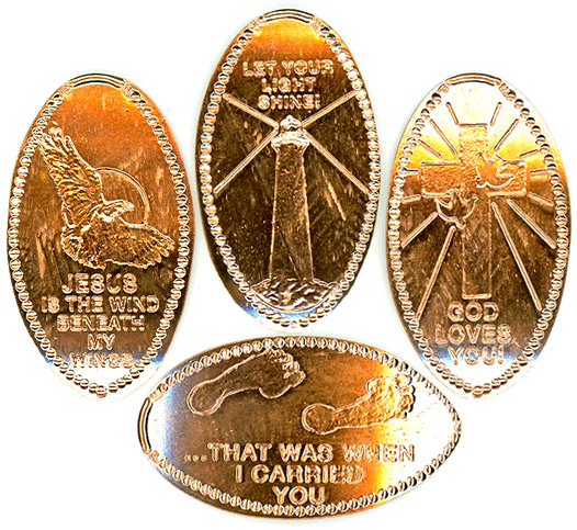 Retired 1: 1) A set of footprints and the words "...That Was When I Carried You." on the bottom, 2) Eagle with the words "Jesus is The Wind Beneath My Wings" at the bottom, 3) Lighthouse with the words "Let Your Light Shine" above the lighthouse and, 4) Cross with the words "God Loves You" at the bottom.