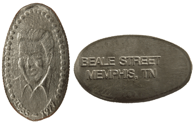 1) (V) Elvis's head,"1935-1977" (obverse); "Beale Street Memphis TN" (reverse). Inside the store