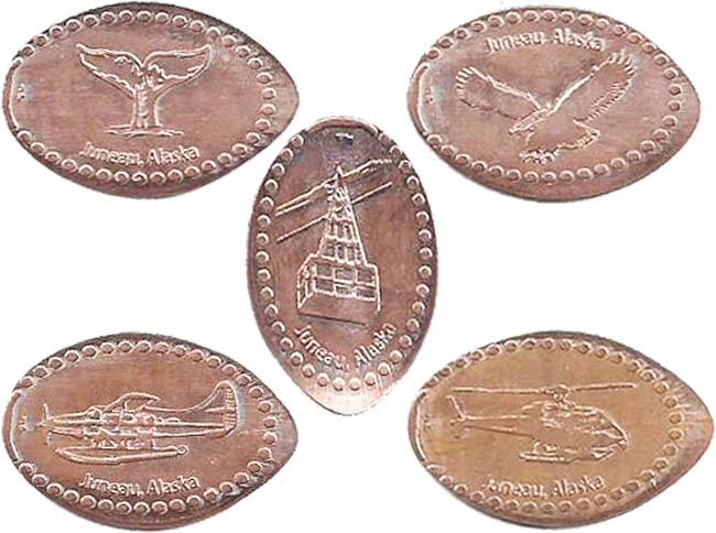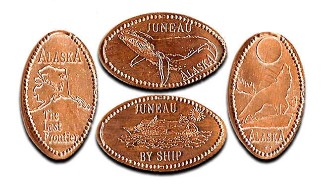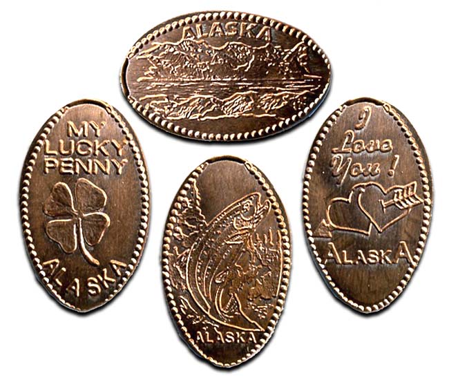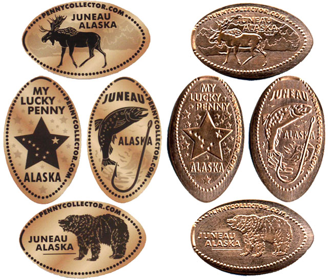 Retired 3: 1) 'Juneau, Alaska', Moose, 2) 'My Lucky Penny, Alaska', Alaskan Star, 3) 'Juneau, Alaska', Salmon and a fishing hook, 4) 'Juneau, Alaska', Bear.