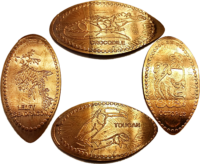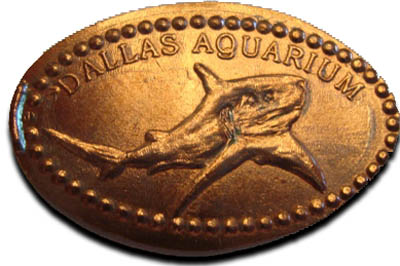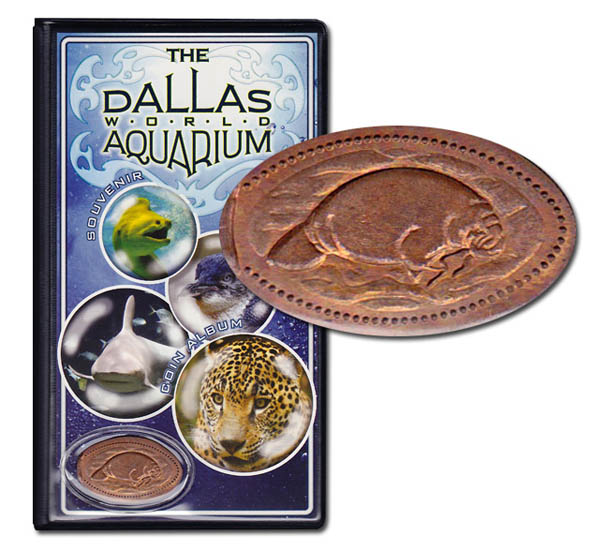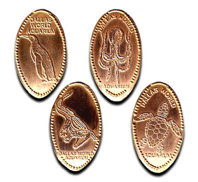 Machine 4 - Costs $1.01 to press. The words Dallas World Aquarium are on the back of each. It is located directly before the final exit. Two sided designs are: