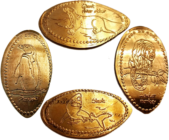 Machine 3. Costs $1.01 to press. The words Dallas World Aquarium are on the back of each. It is located by the bookstore before the penguin enclosure. Two sided designs are: