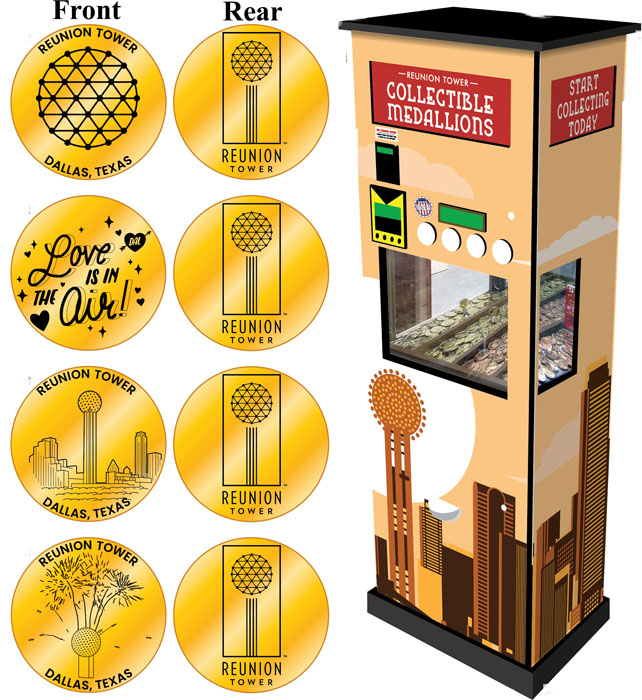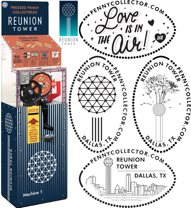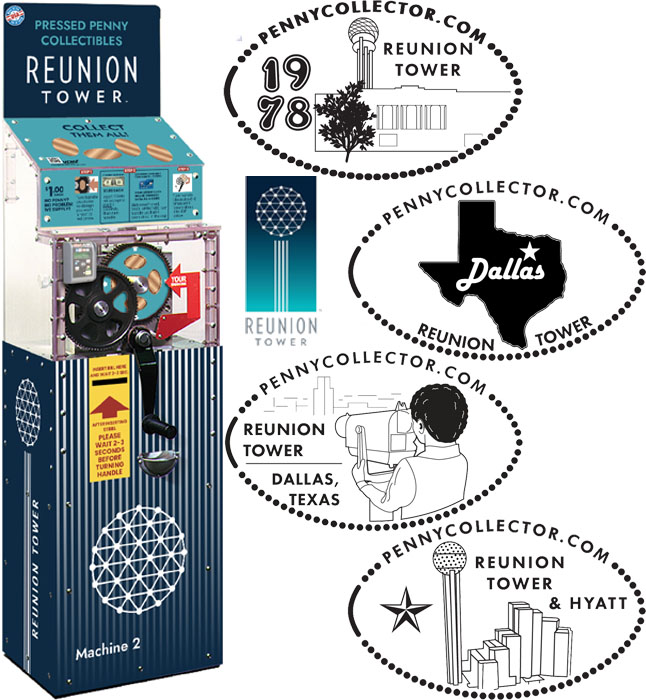 Machine 4: The machine is in the Geo-Deck. All have 'Reunion Tower' on them. Designs are: