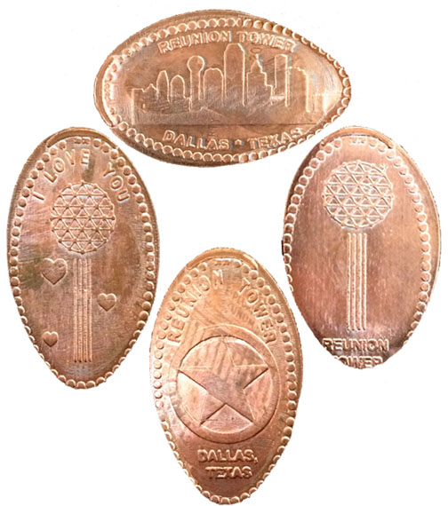 Retired 2: 1) Reunion Tower with "I Love You" and hearts around top, 2) Image of Dallas Skyline with "Reunion Tower Dallas TX, 3) Star in a circle with "Reunion Rower Dallas Texas", 4) Reunion tower with 'Reunion Tower', Rear- Reunion Tower Dallas * Texas.