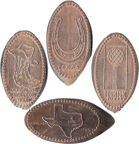 Retired 3: 1) Reunion Tower, 2) Cowboy hat and boots: 'Deep in the Heart of Texas', 3) Texas state outline with a star marking Dallas, 4) Horseshoe, Rear- Reunion Tower Dallas * Texas.