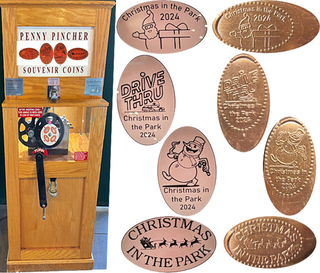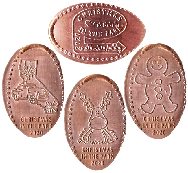 Retired 2020 designs were: All have 'Christmas in the Park 2020' on them. designs were: 1) 'A Drive Thru holiday', 2) Reindeer head, 3) Snowman, 4) Old truck over the image of California.